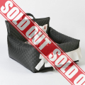 側面にはエレガントなフリルとリボンの装飾、上部には取っ手付き、お色はブラック、本体におけるコットン生地はキルティング加工と撥水加工があわさったデザインとなっております。